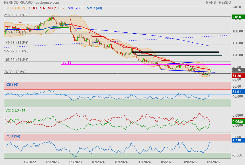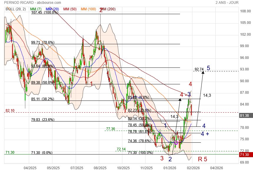 (Boursier.com) — Pernod Ricard avance de 1,5% à 84,7 euros malgré l'annonce d'un chiffre d'affaires en baisse de 7,6% au premier trimestre, à 2,38 milliards d'euros. Un recul légèrement plus marqué que prévu et impacté par une baisse aux États-Unis et en Chine, alors que les effets des droits de douane mondiaux et la faiblesse des économies continuent de peser sur le secteur des spiritueux déjà en difficulté. Le consensus tablait sur un recul de 7,1%.