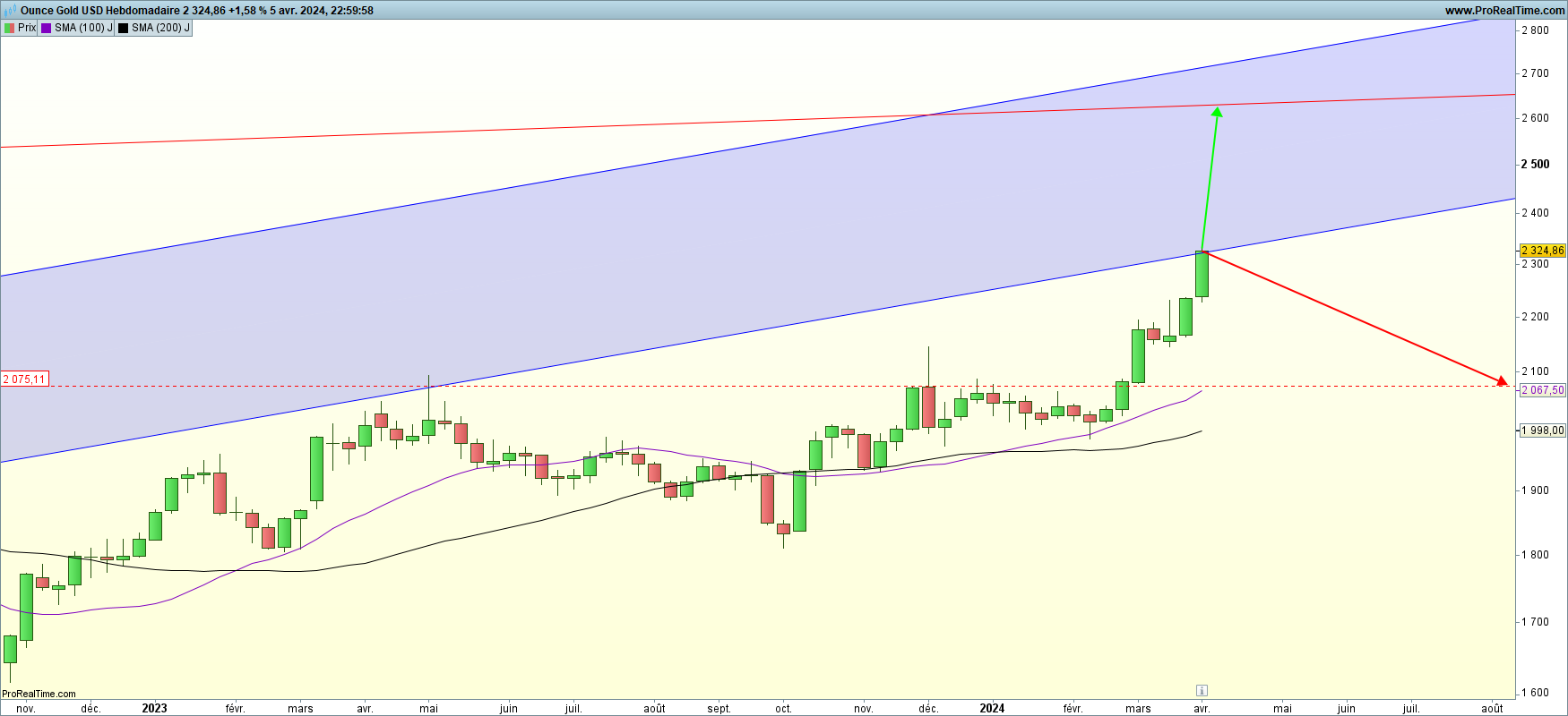 « L'or teste la résistance des 2.000 dollars sous l'impulsion de l'incertitude géopolitique, des craintes de récession et des attentes de pivotement des banques centrales », pointent les experts de Wisdom Tree. Cependant le métal jaune est confronté aux vents contraires d'un dollar américain en hausse (quand le dollar monte l'or baisse) et d'une vente massive d'obligations (devenues moins attrayantes après une belle année 2023), poursuivent-ils ce qui rend « toute prédiction hasardeuse ».