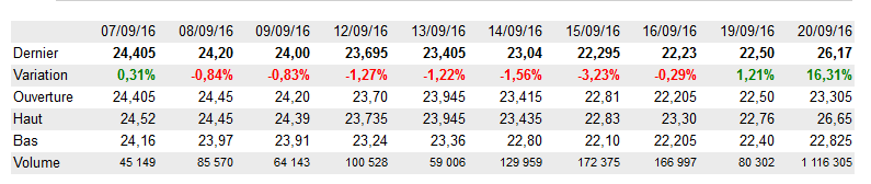 Mon cher Jérémie25 il semblerait que depuis le (20/09/2016 16:10:47)(le jour ou vous m'avez traité de guignol ) l'action se trouvait (a un plus haut par rapport a aujourd'hui ), résultats aujourd'hui elle est a un plus bas , il se trouve que le guignol , ne serait pas si guignol que ça ,
