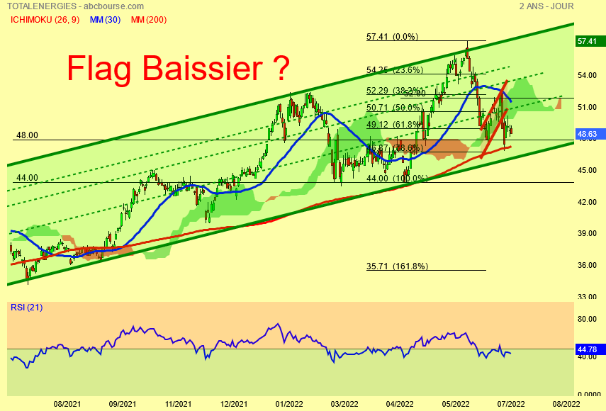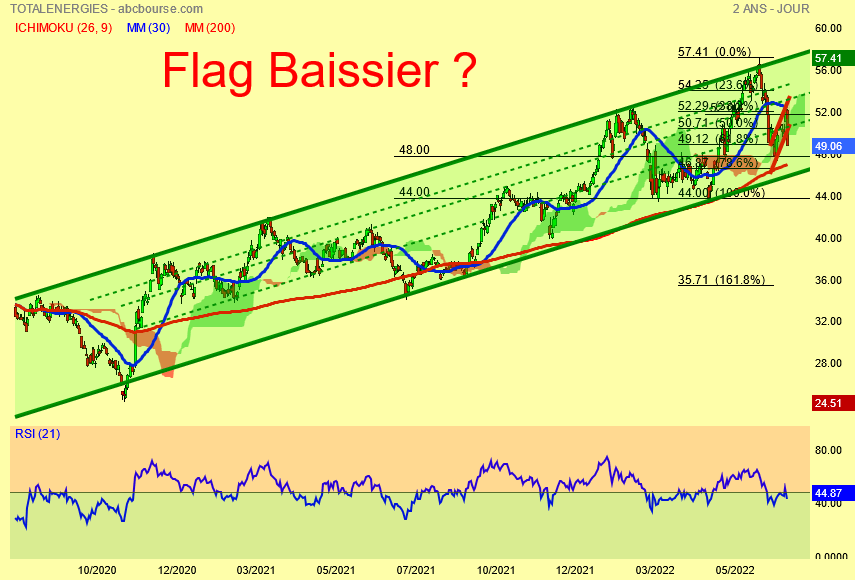 Précision : si le flag baissier se vérifie alors la sortie baissière du canal haussier deviendrait effective , mieux encore le cours de Total est rentré par le haut dans le canal si la logique est respectée alors la sortie sera vers le bas confirmant au passage le Flag baissier .