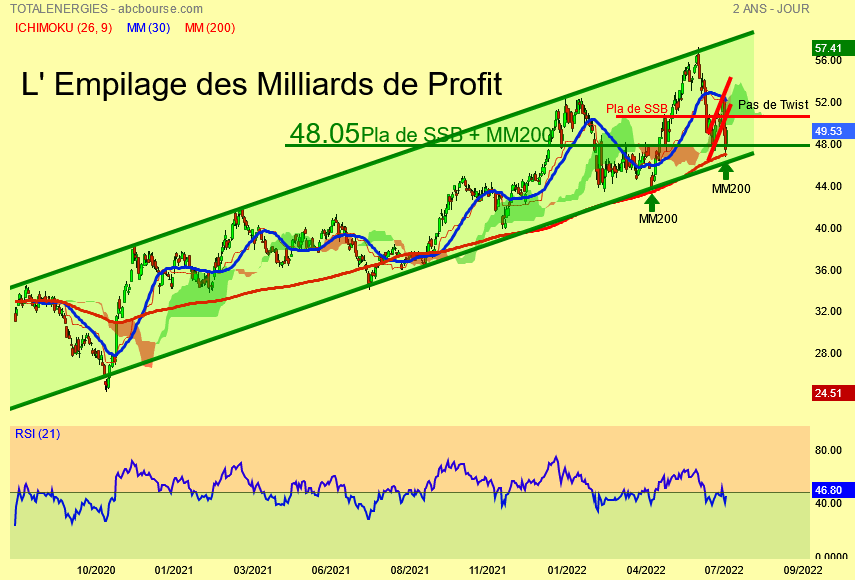Support actuel à 48 € , résistance actuelle le fibo des 61.8 % à 49.12 € , la MM200 rouge haussière reste support en revanche le RSI 21 est en zone verte celle de la baisse .