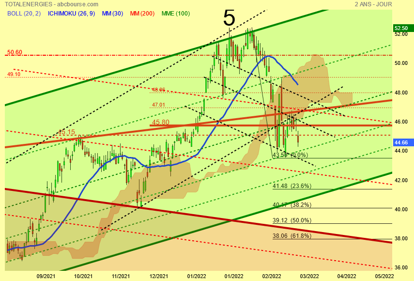 Premier objectif baissier pas bien méchant à 43.59 € si cassure de ce niveau alors utilisation des extensions de fibonacci pour les niveaux suivants .