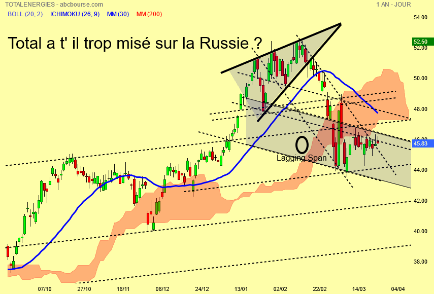 Ce graphique envoie t' il un message du marché qui pense que Total pourrait quitter la Russie si tel était le cas alors la chute sera spectaculaire .