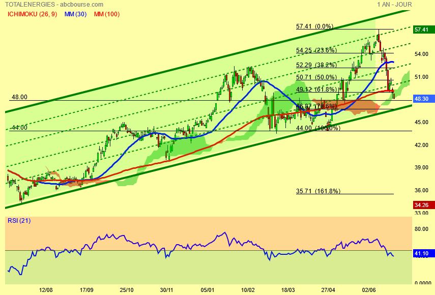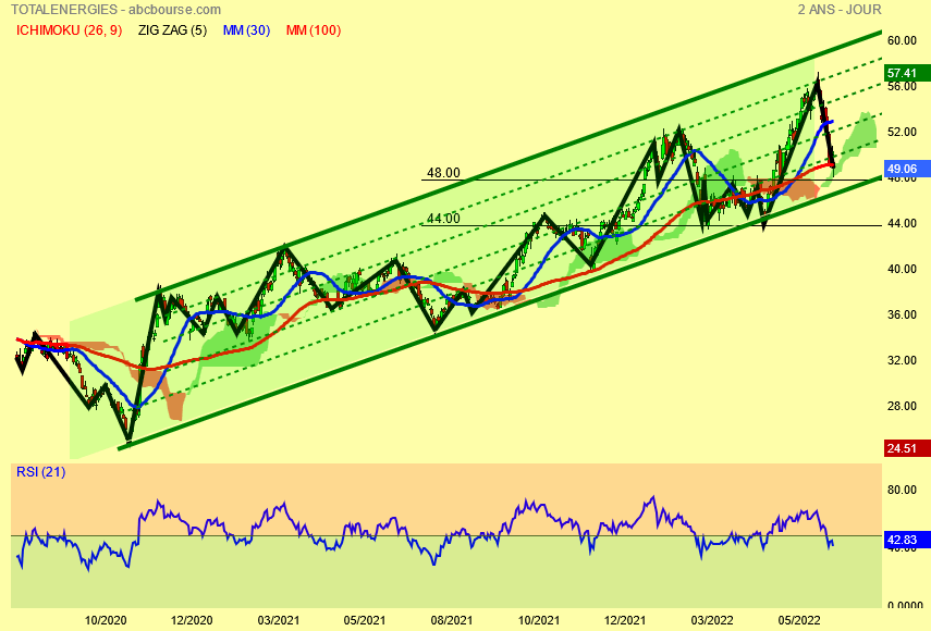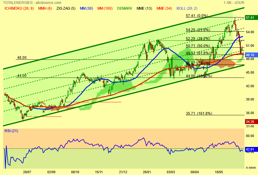 Pas de chance pour Total , le Pla de SSB sur les 48 € a rejeté le cours vers le Sud au moment même où le cours devait sortir du nuage ( voyez ichimoku c ' est du lourd comme les 48 € )