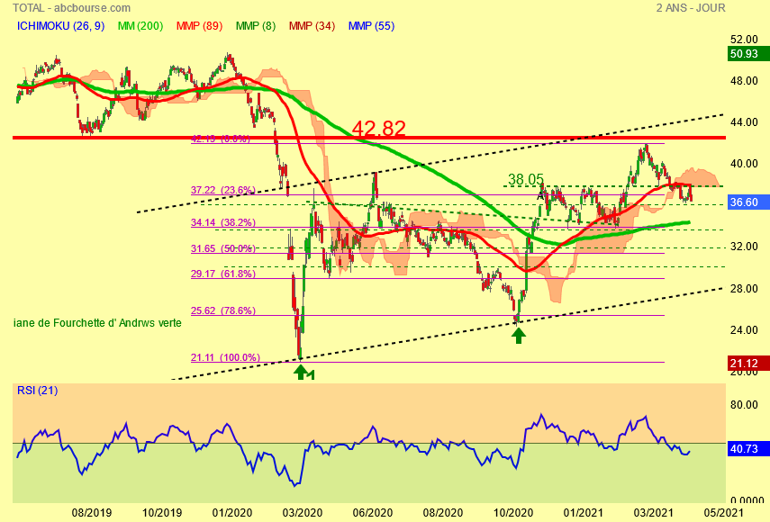 La MMP89 rouge est devenue résistance à 38.12, le cours est sous toutes ses MMP , mieux encore en analyse ichimoku , pla de SSB à 38.05 euros est résistance , cours sous le nuage , sous tenkan et Kijun parfaitement alignés à la baisse .
