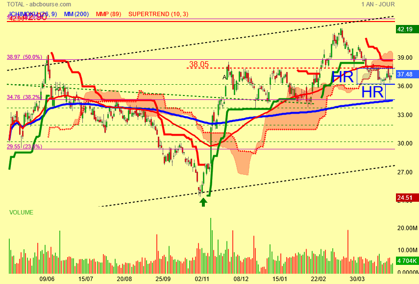 Très simplement , Supertrend rouge puis cours est venu s' écraser contre le pla de SSB du nuage à 38.05 euros , la MMP 89 rouge est résistance .