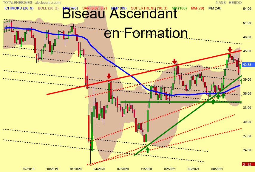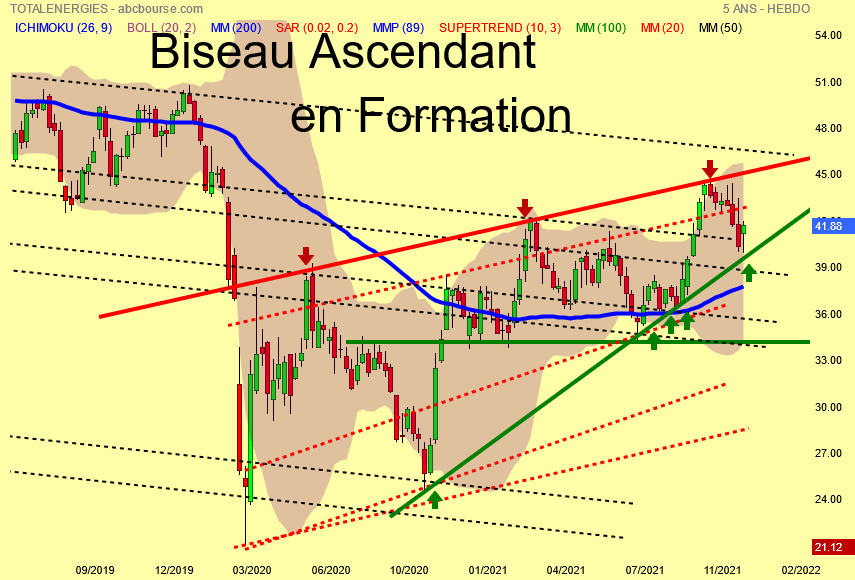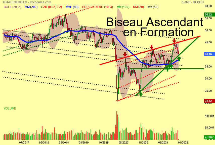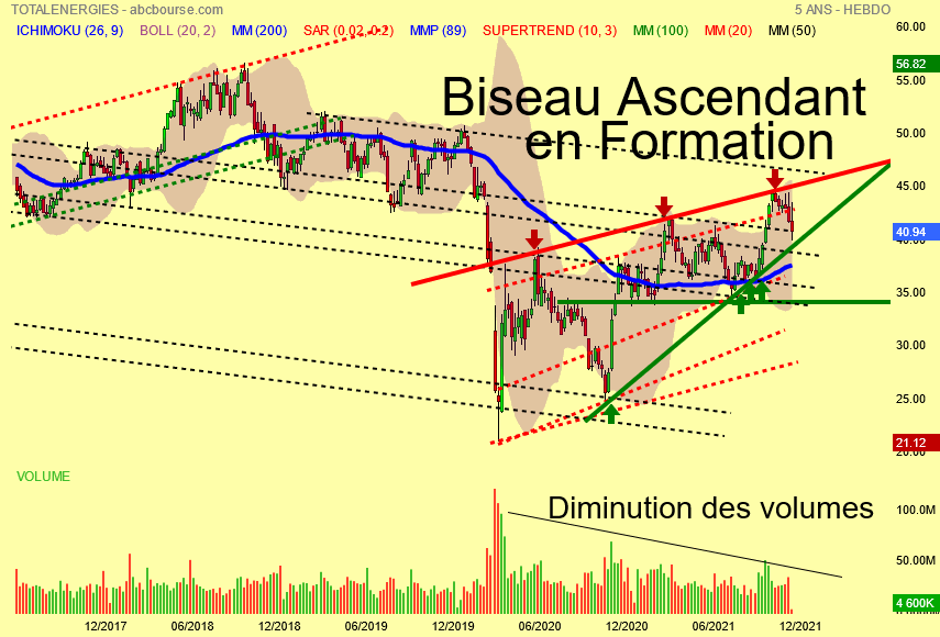 Résistances à 42.70 puis 44.70 € mais il reste le Biseau ascendant en formation