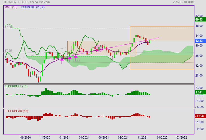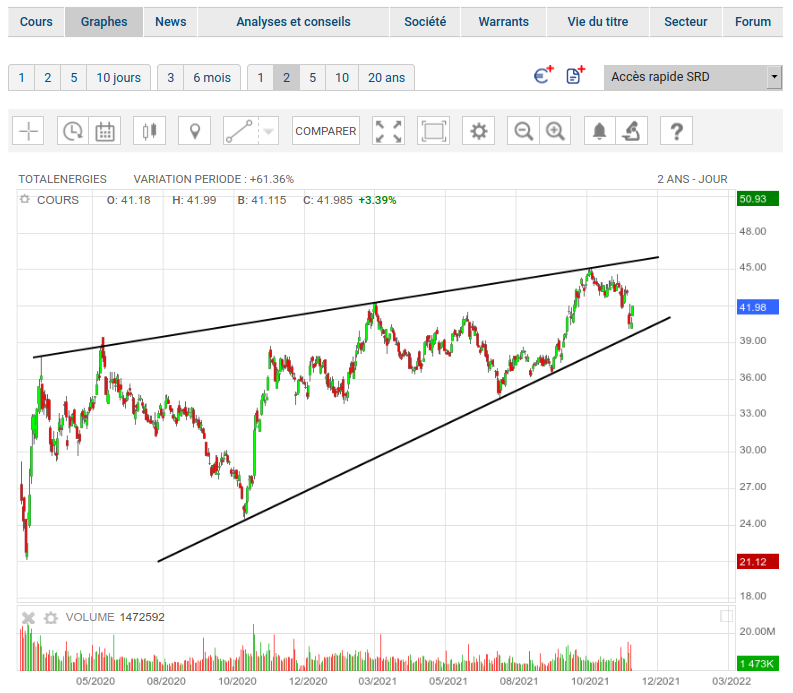 Malgré la hausse du cours du pétrole Total est en phase de correction .