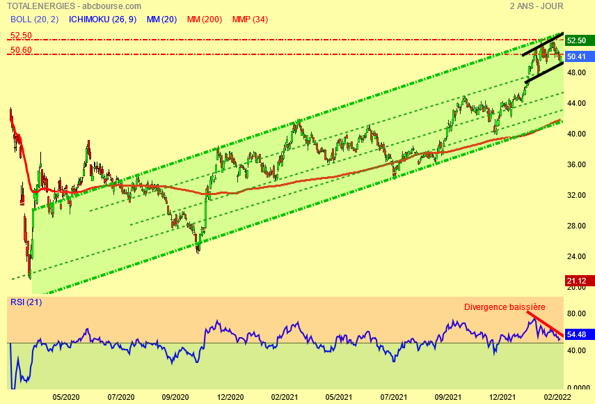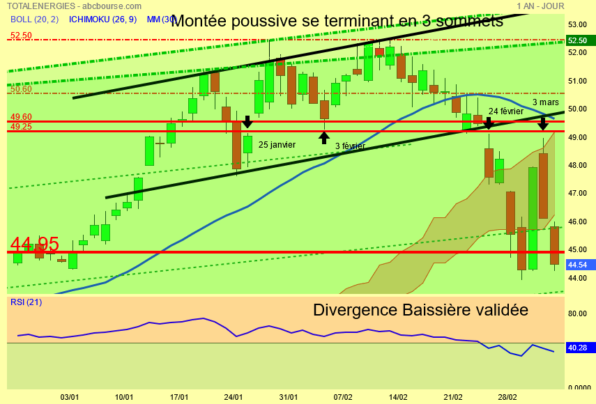 La hausse de Total s' est terminée en montée poussive en 3 sommets dont les niveaux des 2 éme et 3 éme sommet sont identiques sur les 52.50 € résistance majeure et pourtant dans le même temps le RSI lui battait en retraite en divergence baissière .