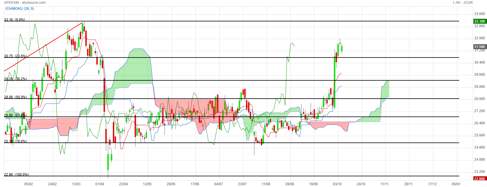 Cours testant le Fibo des 23.6 % situé à 45.33 €