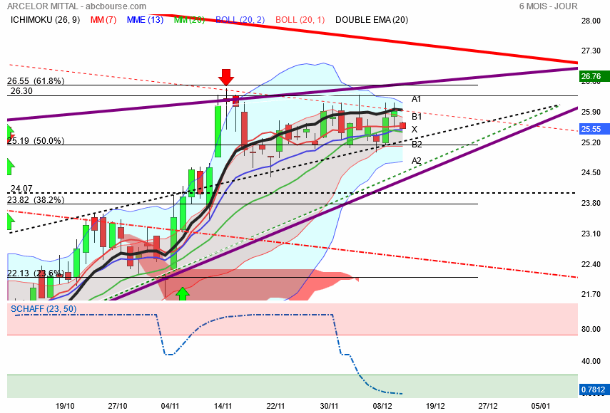 Nous avons un resserrement généralisé des bandes de Bollinger entre A1 et A2 , le cours progresse peu , sa volatilité diminue fortement . Un futur mouvement d' importance est en gestation , tout cela se produisant dans le BISEAU ASCENDANT à l' après de la zone du fibio des 61.8 % à 26.55 € toute proche du TWIST du nuage baissier hebdo en dessous du nuage .