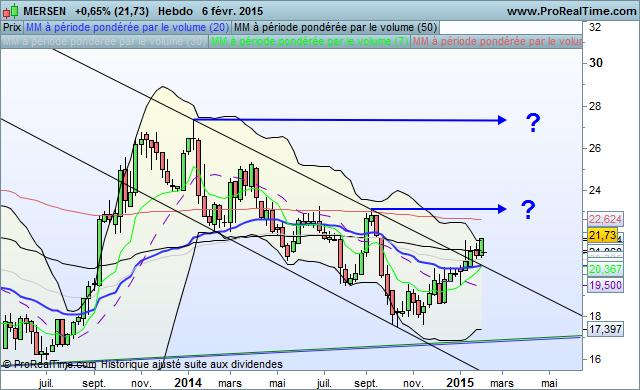 Il m’apparaît que cette action n’est pas très facile à saisir. Graphiquement, je veux dire. J’y suis entré, je dirais à un prix raisonnable, sur le support d’un canal légèrement haussier, et sur la rumeur que GL EVENS était candidat sur le mondial au Brésil. S’en est suivi une descente, surprenante, puis la remontée , normale. Ce que j’ai du mal à appréhender, c’est ce « saute-en-l’air » des jours derniers. Les résus (le Brésil) étaient dans les cours, à mon avis. Alors, que signifie ce « saute-en-l’air » ? Un bruit dans les tuyaux ?