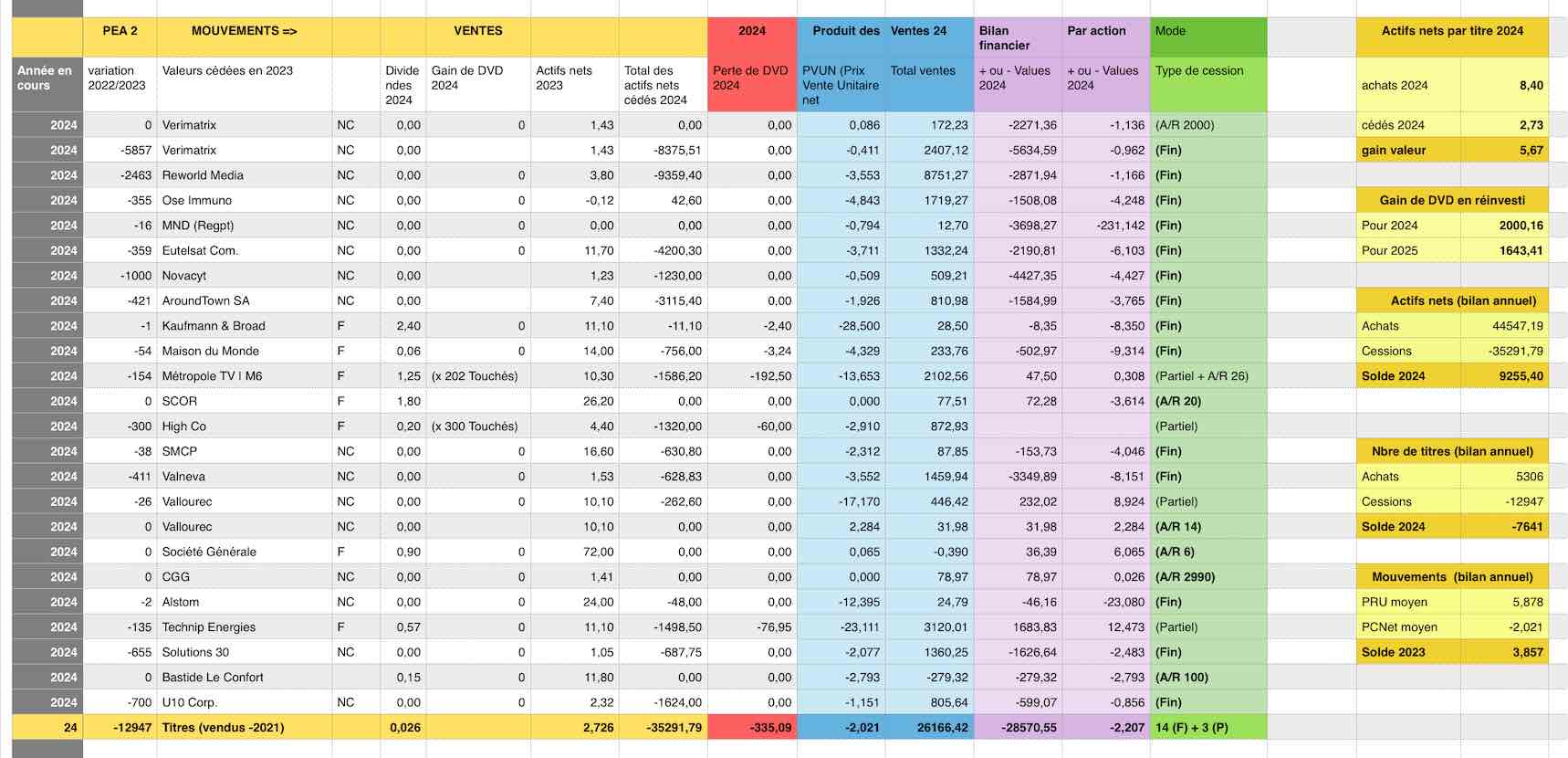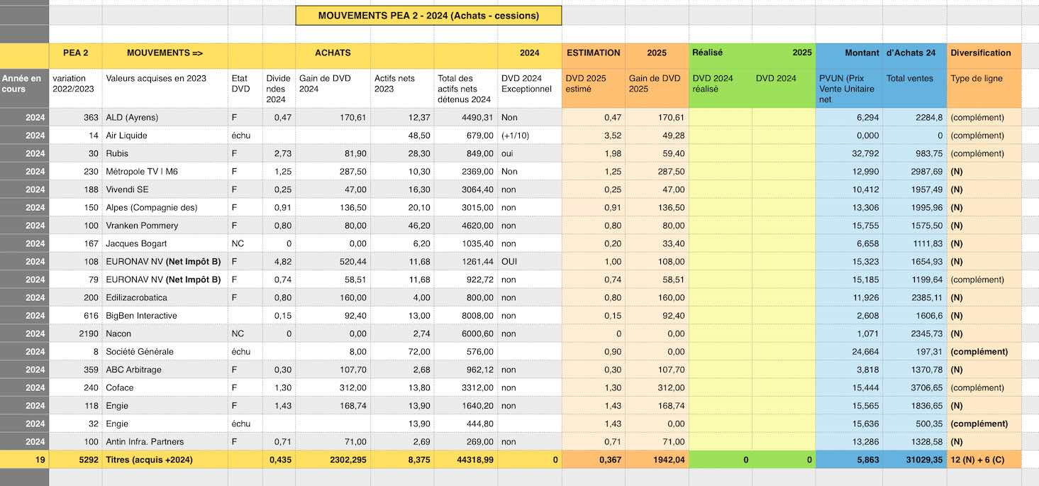 Comme vous le verrez au dessous, sauf sur PEA2 qui a été structuré grandement 2024, l'essentiel de mes investissements en actifs nets joue la carte de la pérennité et du long terme. Ce qui me permet maintenant de dégager du temps pour étudier sans avoir les yeux rivés sur les courbes…