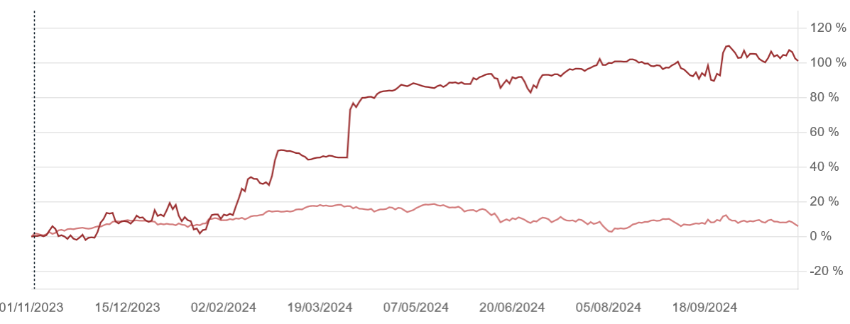1 an glissant : +101% pour méthode en gestion de l'aléatoire, contre +6% pour Cacounet et +38.68% pour l'or.