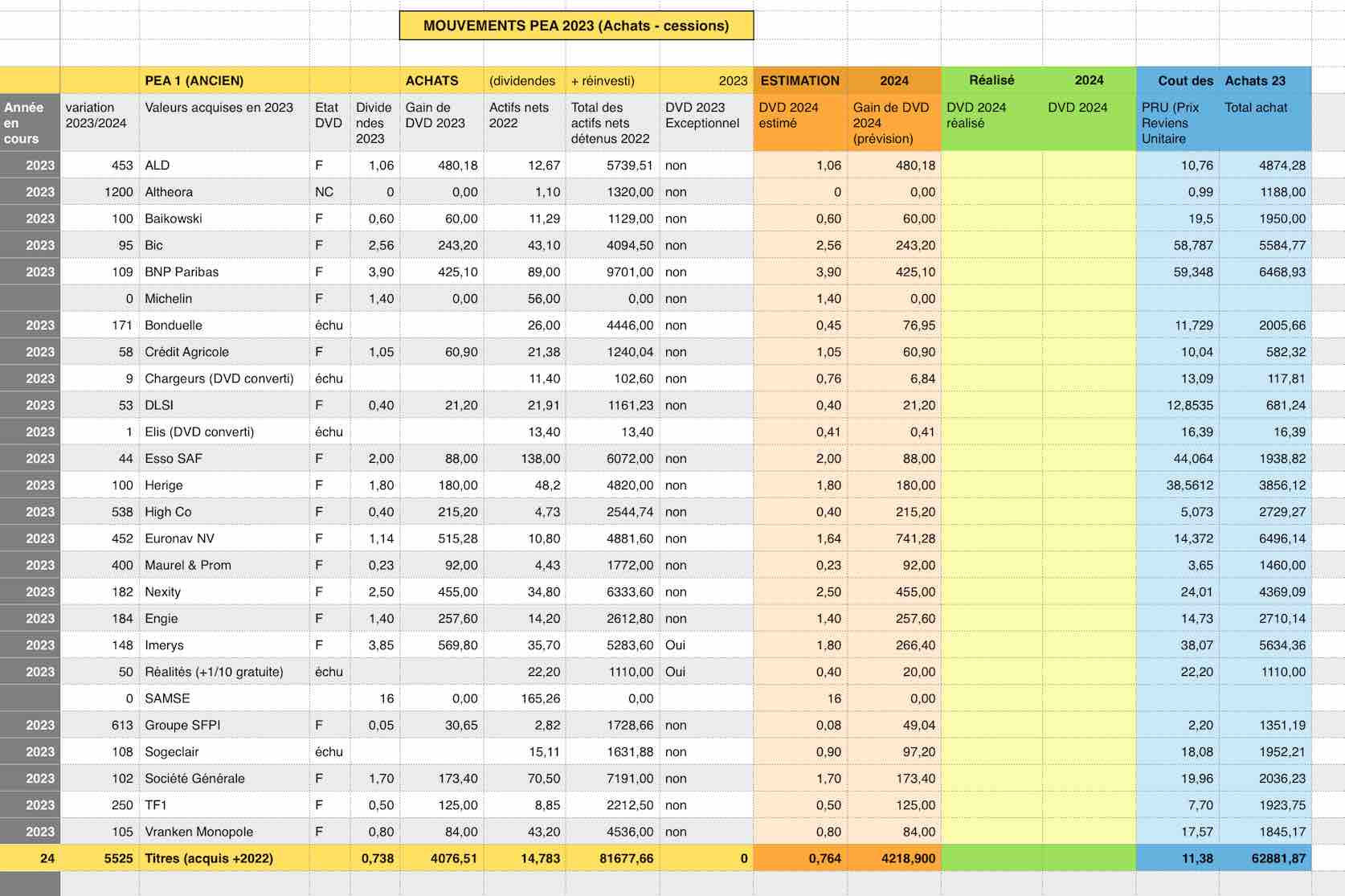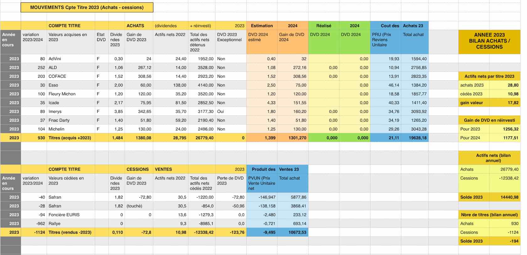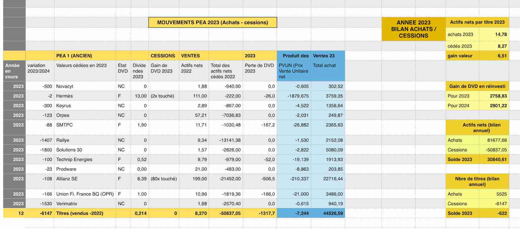 NB : Une erreur que je viens de corriger sur le tableau des ventes, le dividende Safran 2023 est de 1,35 et non comme indiqué de 1,82. Ce qui améliore encore les chiffres de mouvement de l'année.