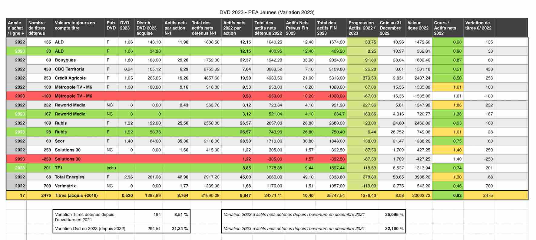 • PEA Jeunes : + 6,43 % de l'évaluation de cours à Fin 2022 + les mouvements de titre sur 2023 (10 lignes actives : réduction d'une ligne)