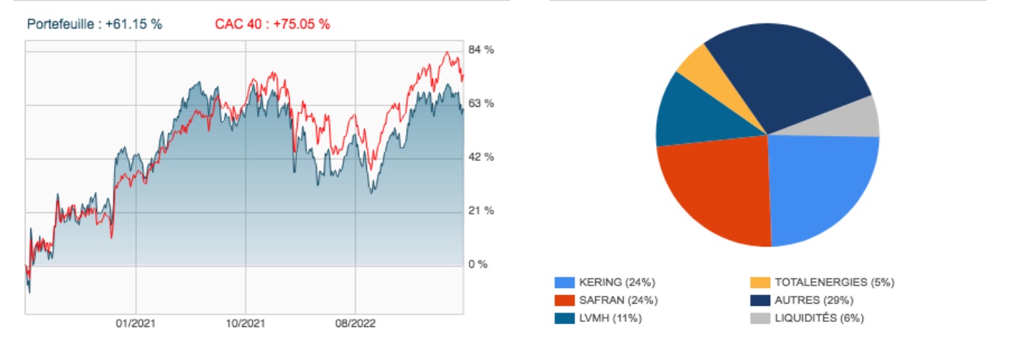 Lignes de force : Kering (25%), Safran (24%), LVMH (11%), Total (5%), autres valeurs (31%) • Liquidités : 4%