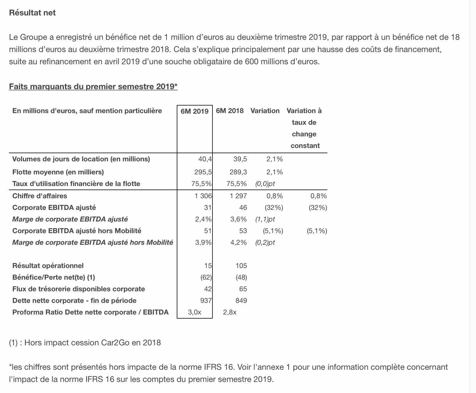Au deuxième trimestre 2019, les Flux de Trésorerie Disponibles Corporate s’établissent à 121 millions d’euros contre 142 millions d’euros au deuxième trimestre 2018. Cette diminution s’explique principalement par des coûts de restructuration plus élevés, conformément aux attentes, ainsi que par un niveau de dépenses d’investissement non liées à la flotte plus important, visant notamment le développement de nos programmes digitaux, et une augmentation des investissements dans la BU Urban Mobility.