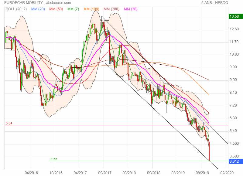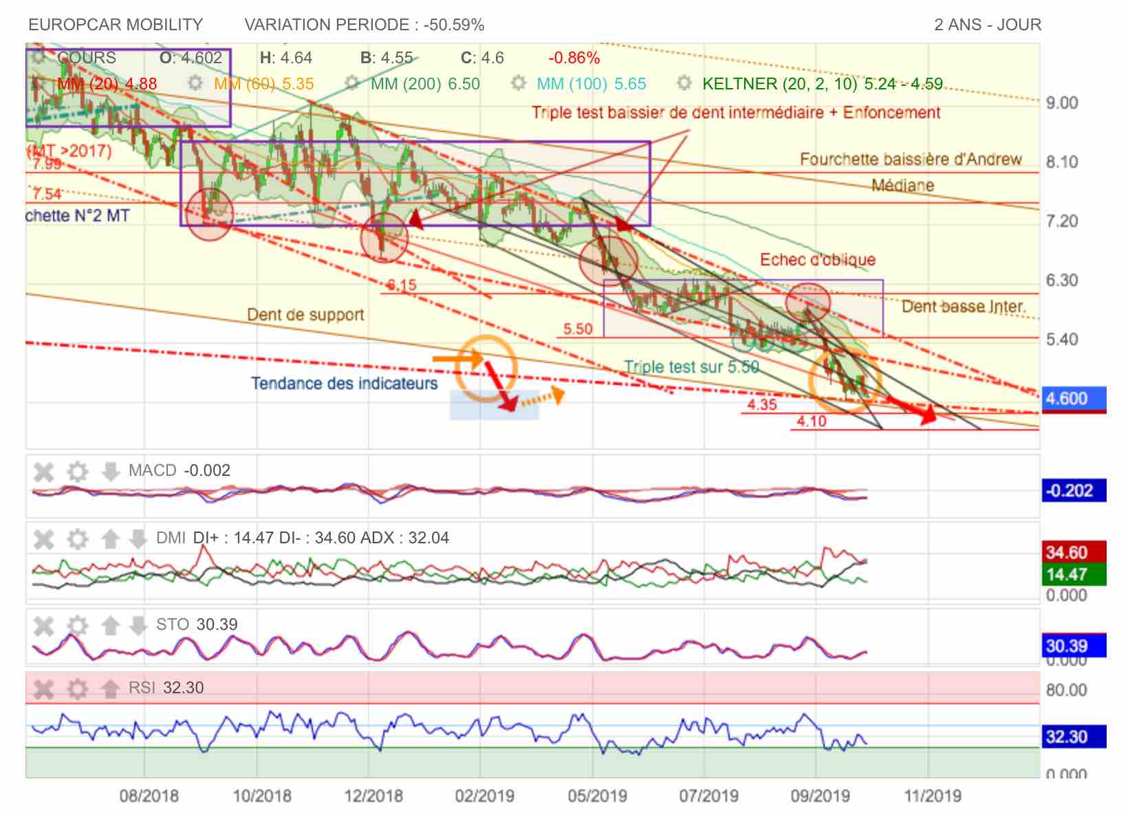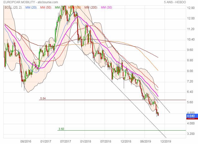 Depuis ce 11 septembre 2019, on se laisse couler à la baisse, et on enfonce tout ce qui se présente. On arrive maintenant vers la sortie de fourchette et sur un support baissier en pointillés rouge qu'il faudrait tenir sinon on va directement sur les point bas indiqués en projections d'obliques vers 4,35, puis 4,10 euros.