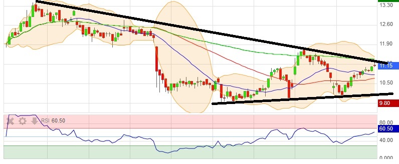 Graphiquement, on constate que le titre est mis en échec sur toutes ses tentatives haussières pour passer les obliques de résistances (Pointillés rouge / obliques bleues). Les indicateurs à l'image du RSI sont donc à la baisse et on pourrait retourner tester les 7.50 dans une formation d'ETE (disproportionnée en largueur).