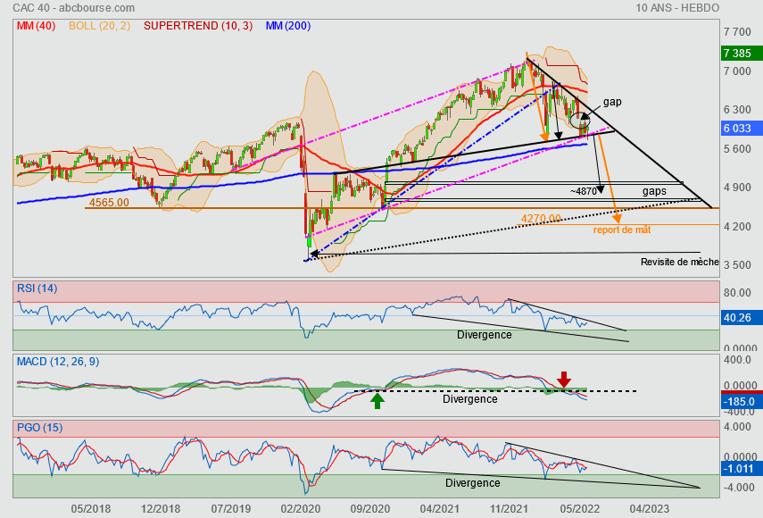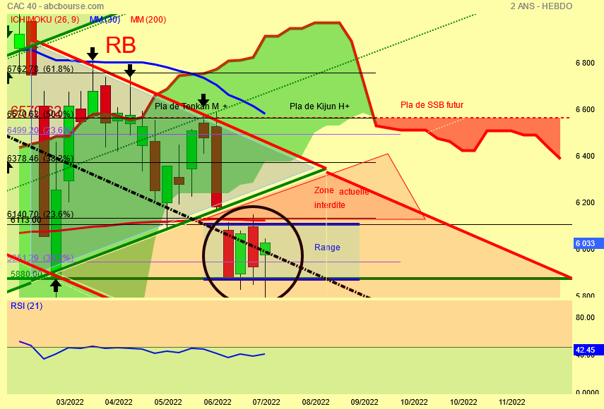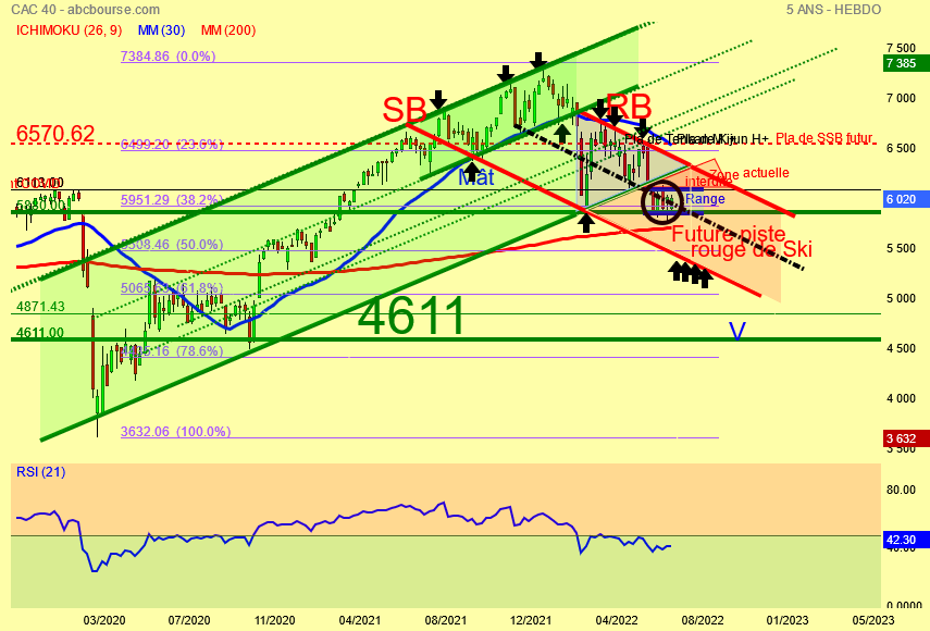 La borne basse de ce range hebdo se situe à environ 5865 points qui est support hebdo actuel depuis le 24 février 2022.