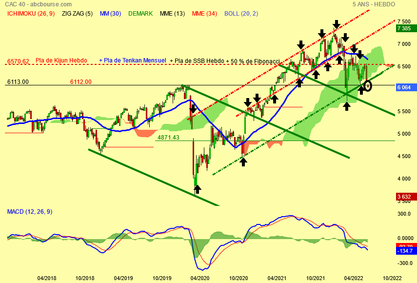 6570.62 est un Pla de Kijun Hebdo mais aussi un Pla de Tenkan Mensuel mais aussi un Pla de SSB Hebdo et par dessus le marché c' est le retracement des 50 % ou Fibo de la baisse comprise entre 7385 points et 5756 points donc en conclusion c' est la RESISTANCE MAJEURE du moment impossible à franchir . Vous y rajoutez l' INFLATION causée par les BANQUES CENTRALES auquelle s' ajoute l' INFLATION de la guerre d' Ukraine , et l' installation du FLEAU INFLATIONNISTE qui se généralise sans compter que les beaux parleurs des banques centrales nous avaient dit que l' inflation était temporaire .