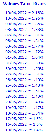 Ci dessous le taux de l' OAT a grimpé de 50 % passant de 1.40 % à 2.20 % du 13 mai au 13juin 2022 en 1 mois .