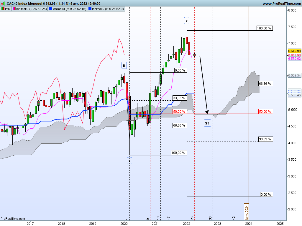 En mensuel le span 26 est en cours, la suite logique est une vague baissière S que je verrais bien atterrir vers les 5000....