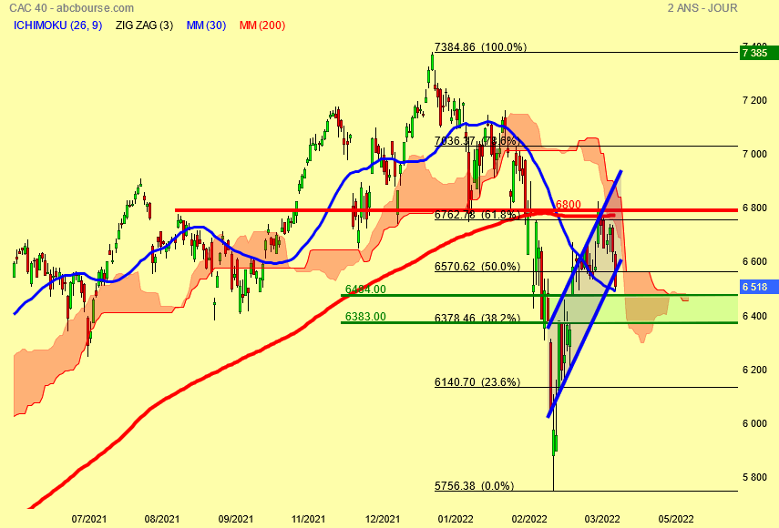 Le retournement est imminent , peut être ira t'il une dernière fois dire bonjour et au revoir au fibo des 61.8 % vers 6730 points mais de toute façon reprendra le chemin baissier puisque nous sommes en zone d' incertitude .