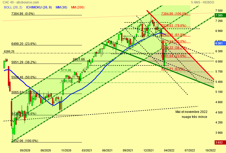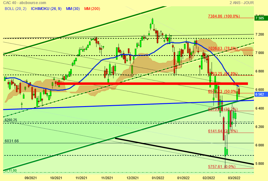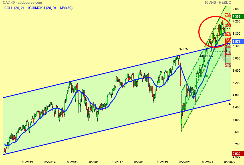 Violent décrochage du Cac 40 de 7385 à 5756 points ce qui l' a ramené dans son canal haussier d' origine bleu et que fait il depuis les 5756 points ?