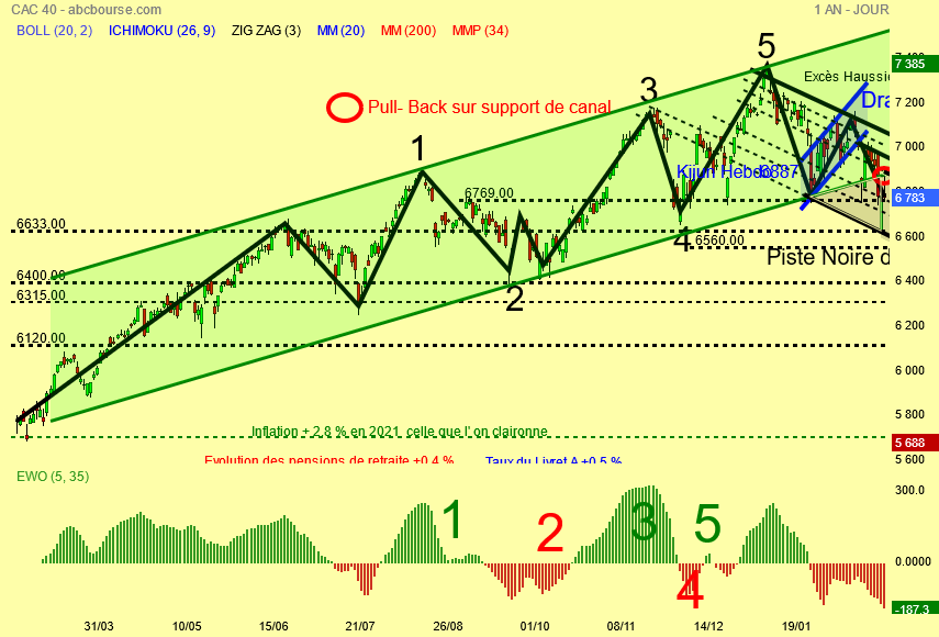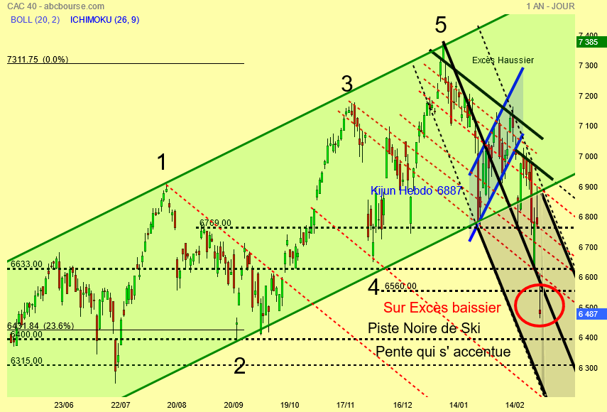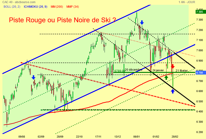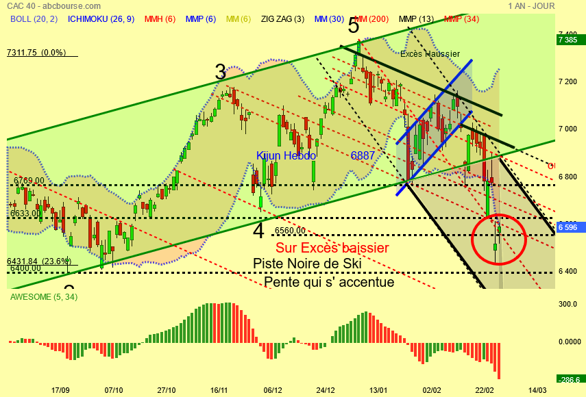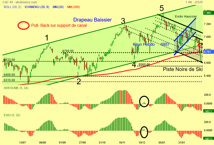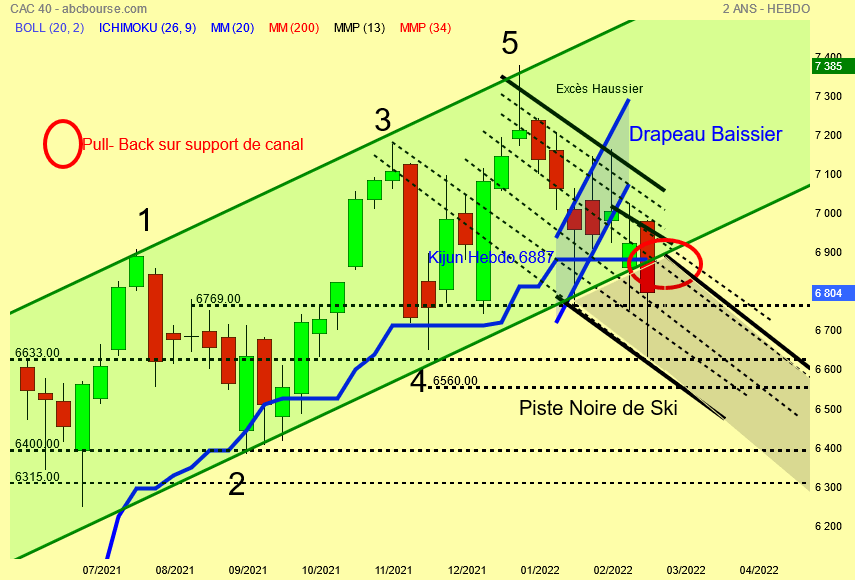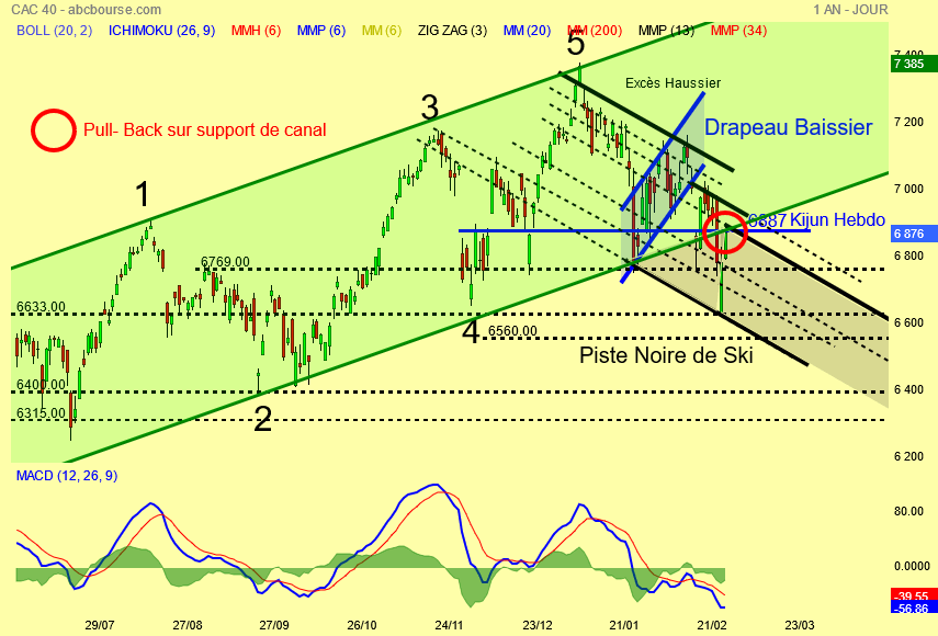Je confirme et bien visible la présence de la Kijun hebdo plate à 6887 points , le pull-back ce jour sur le support haussier vert du canal et l' entrée du Cac 40 dans la piste noire de ski .