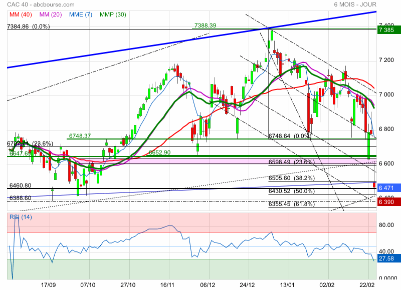 On passera en tendance baissière à 6420 points ensuite on rejoindra 6120 points mais si tu prends les retracements de fibonacci entre le 16 mars 2020 et le 5 janvier 2022 cela te donne des niveaux , le 50% est à 5880points