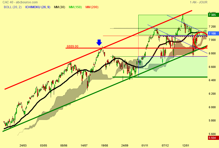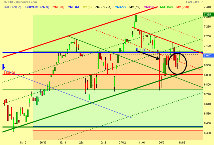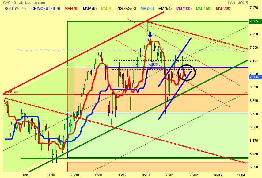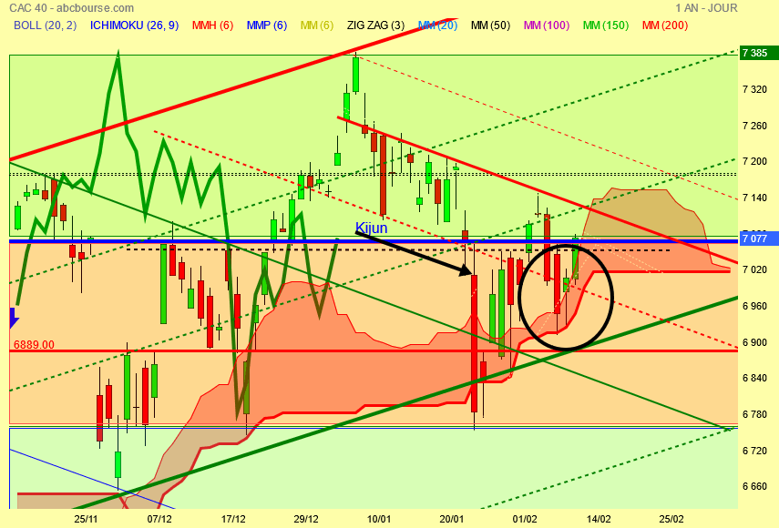 En ce début de février , on nous refait le même coup qu' au début janvier à savoir rebond pour franchir une résistance qui n' est autre que la Kijun journalière à 7069.55 points en BULL-TRAP et par derrière aujourd' hui avec la BCE Boum , le cac re franchit la kijun en marche arrière .