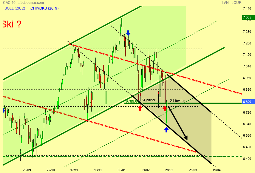 Les deux flèches rouge indiquent les niveaux de clôture des 24 janvier et 21 février 2022 , suffit de relier et vous avez la résistance majeure à 6789 points