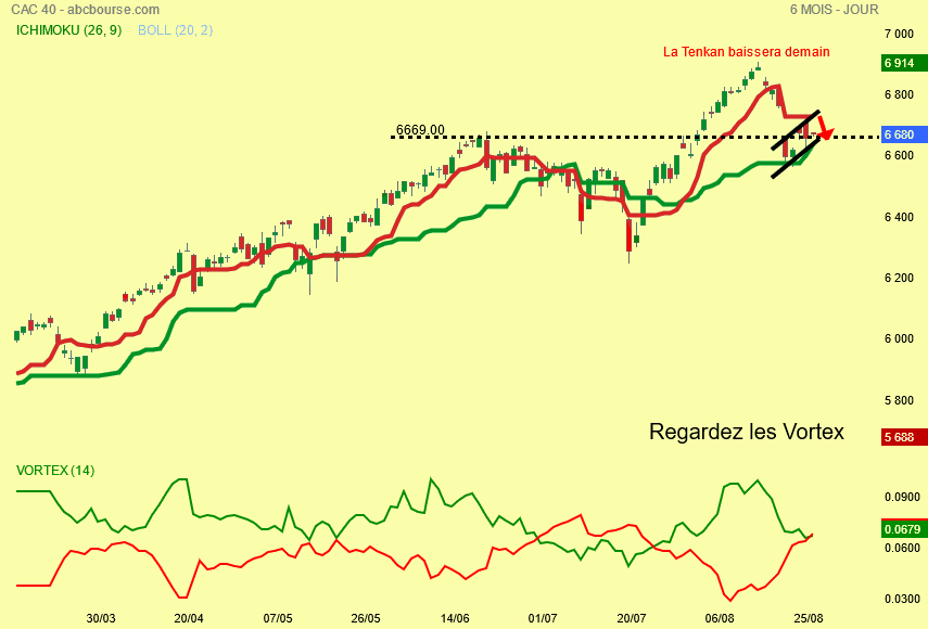 6 - Regardez l' écart Tenkan Kijun qui était très important au moment du plus haut à 6914 points maintenant cet écart se resserre , correction à venir ?