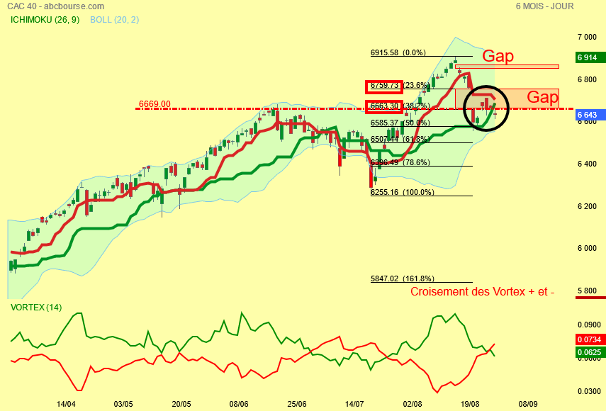 3 - Un rebond s' est formé entre 6560 et 6760 points dans le canal haussier vert ce qui a tout juste permis de combler le second Gap de Continuation du 19 Août.