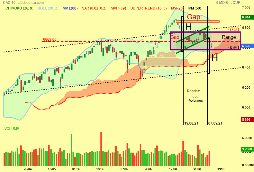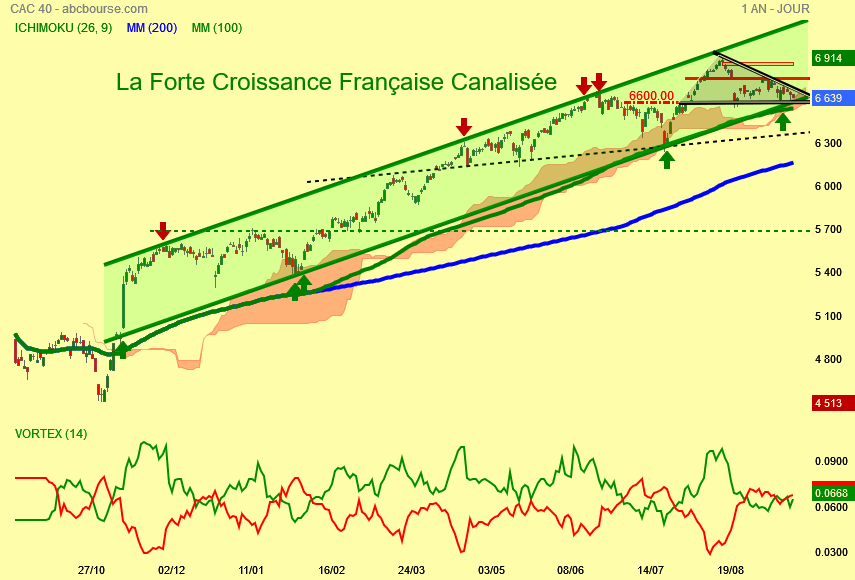 Une figure chartiste en TRIANGLE RECTANGLE est apparue avec comme support actuel 6600 points et une résistance baissière à partir du plus haut des 6914 points le 13 août dernier .