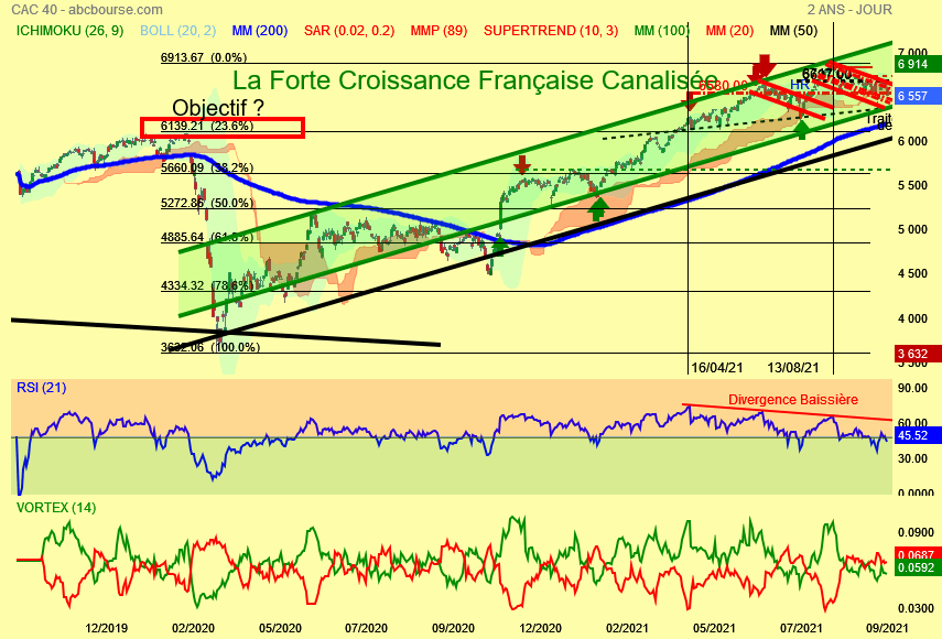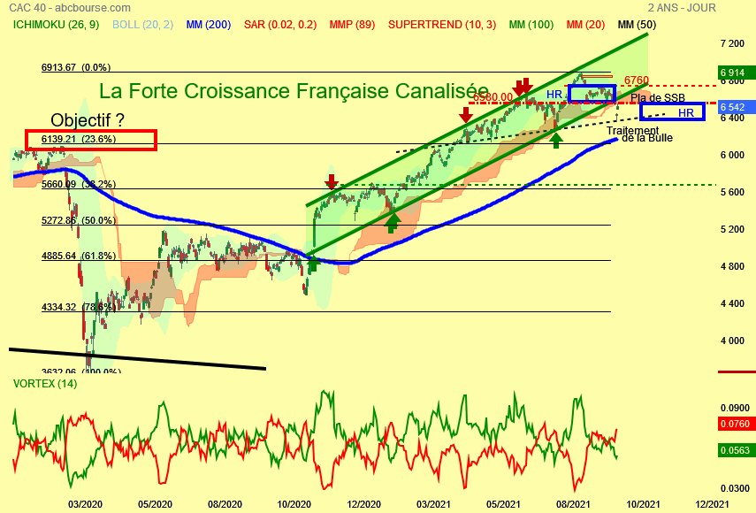 La croissance française pour 2021 est évaluée à 6.25 % cela se traduit sur le graphique par le canal haussier vert conforté par la MM100 verte .