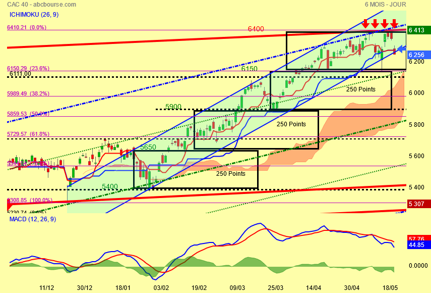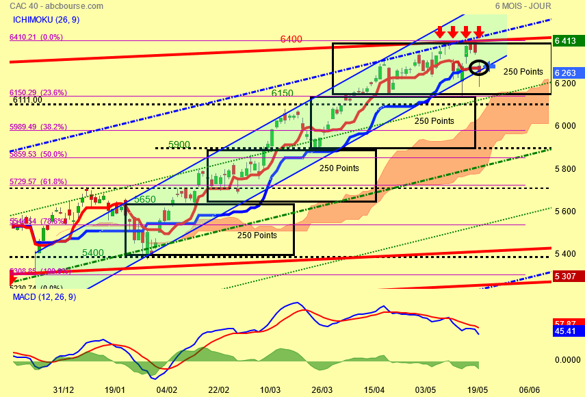 le cours en clôture à 6263 points est venu tout juste se poser sur le support haussier bleu du canal en formant une espèce de chandelier en MARTEAU avec mèche longue et petit corps ( dans le petit cercle noir avec flèche bleu ).