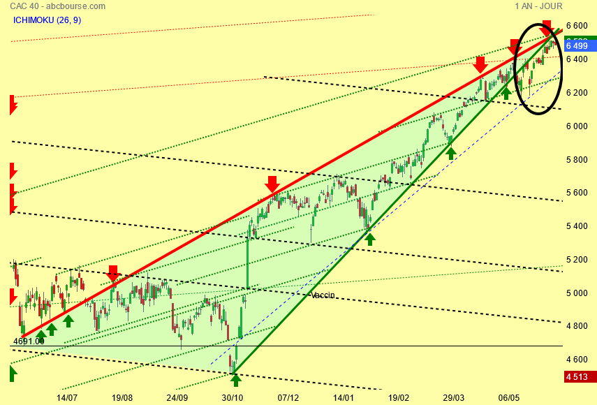 Mais dans le cas du Cac 40 ce qui cloche est la sortie baissière du BISEAU ASCENDANT suivie de la remontée avec des volumes qui diminuent .