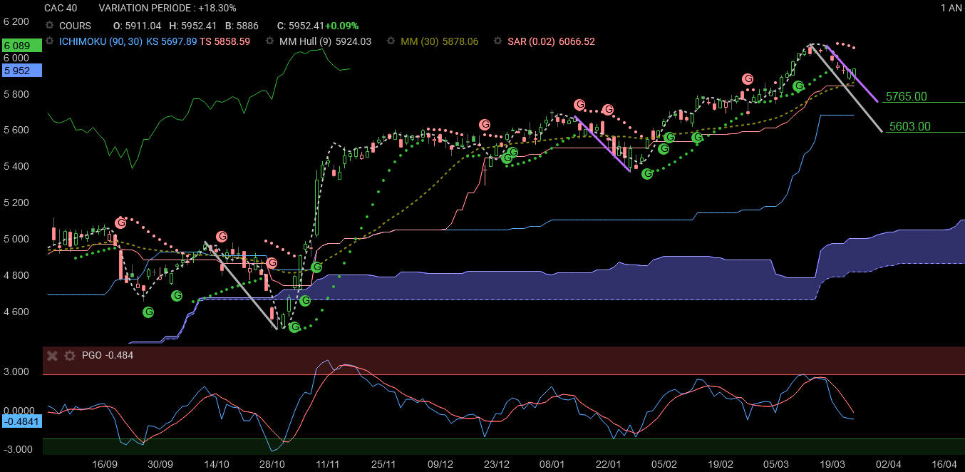 - la MACD est positive baissière sous sa ligne de signal rouge à + 69.36 donc ce n' est pas inquiétant , rien n' est inquiétant , tout va bien mais va falloir passer Avril et surtout le mois de MAI.
