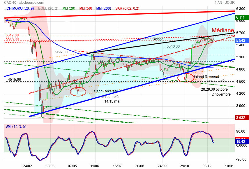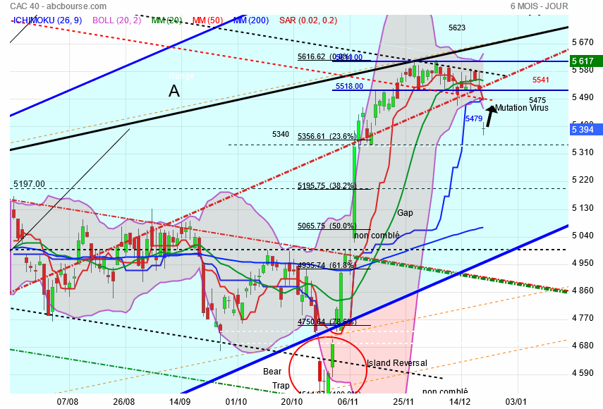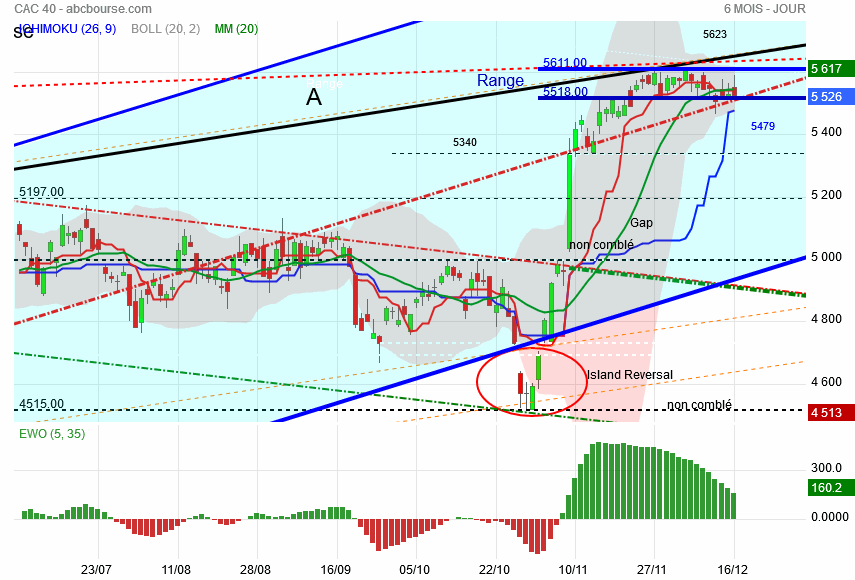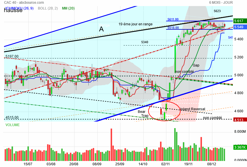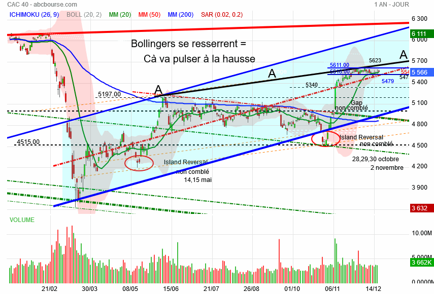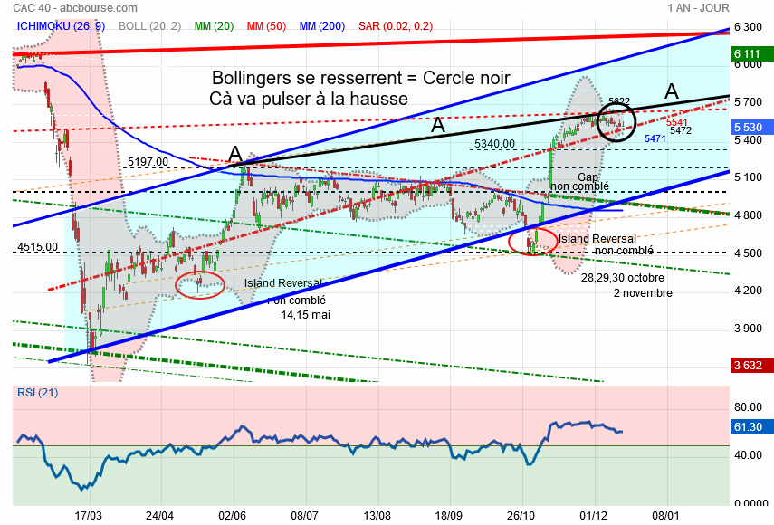 Demain , disparaitra du tableau des 10 jours de cotation la journée du 4 décembre dernier chiffre 5609 tout le reste étant des 5500, l' étau se resserre , les bandes de bollinger en font autant ce qui présage d' un grand mouvement qui est en gestation .
