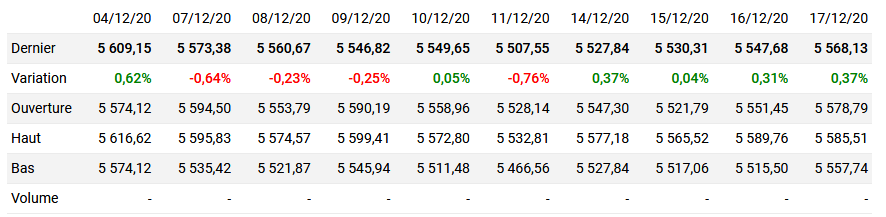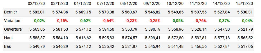 Le tableau çi dessous montre les 10 derniers jours de cotation du Cac 40