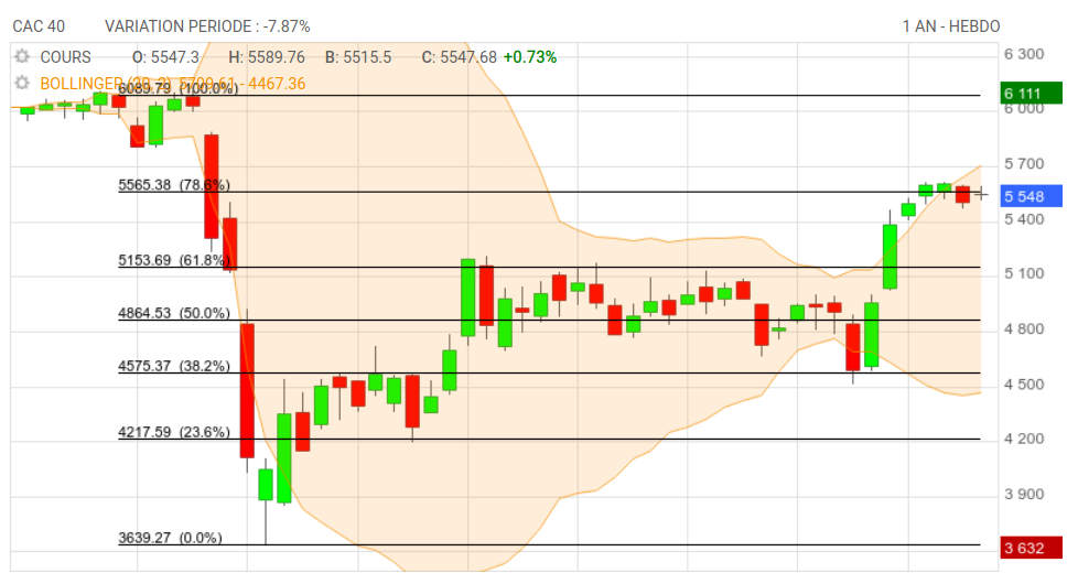 Une reprise de la hausse depuis la sortie de la bande basse de bollinger en pull-back sur le support baissier du canal disons 5500 points .