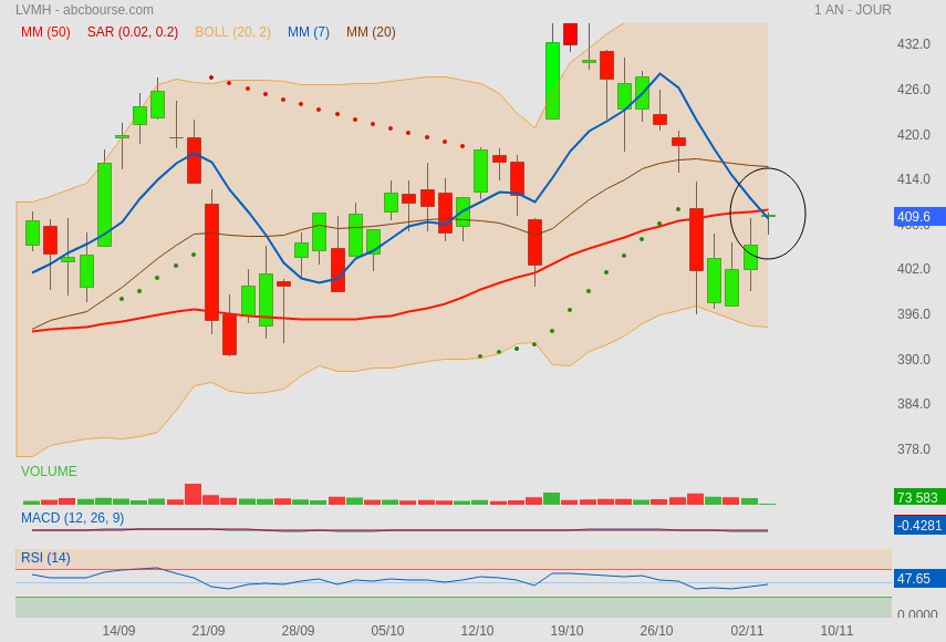 Cassure de canal baissier le 28 octobre en gap de rupture ( volumes étoffés ) tout çà en dehors de la bande basse de bollinger , comme je l' ai indiqué dans les analyses précédentes il fallait le rebond technique pour ré intégrer la bande basse ce qui a été fait .
