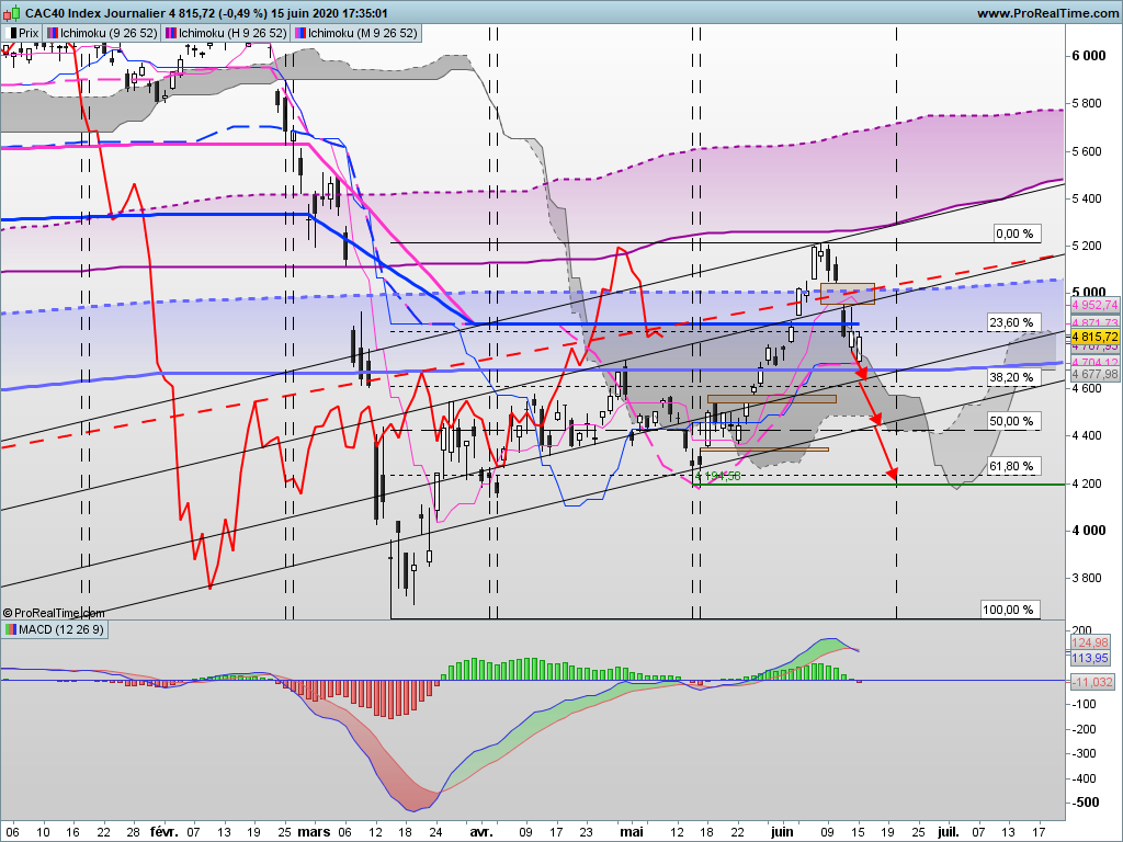 Le chandelier japonais du 2 éme trimestre est un SASHIKOMI ( voir mon analyse du 30 avril 2020 ) devant valider une reprise baissière de l' indice .