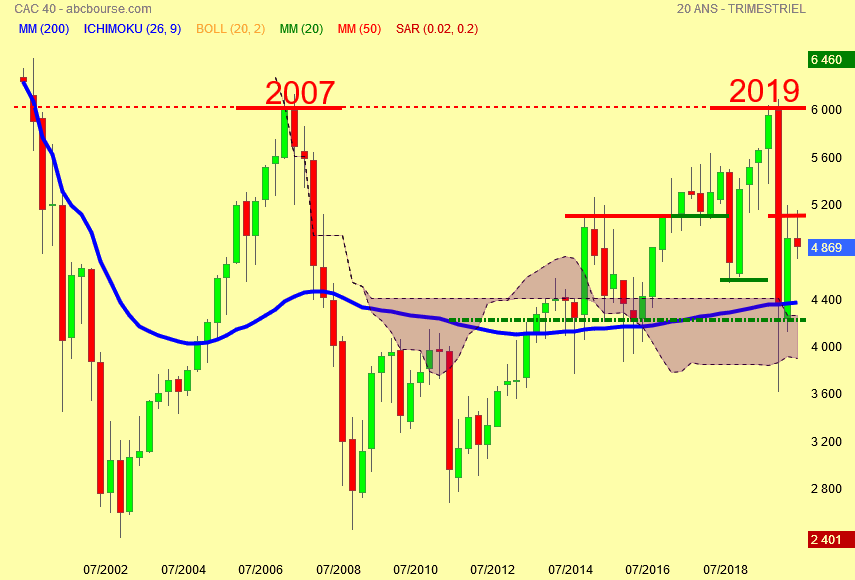 2 - Coincidence de taille entre les sommets de 2007 et 2019 sur deux trimestres consécutifs qui représentent des Résistances Majeures au dessus des 6000 points .