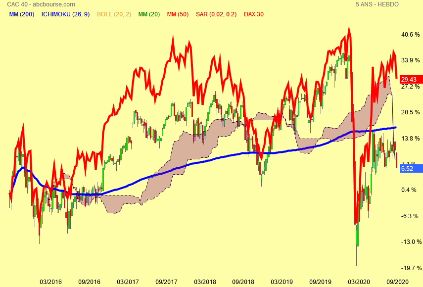 Jusqu' à l' apparition du COVID , Dax et Cac se suivait , le COVID et le confinement ont eu raison du Cac 40 , les sociétés françaises qui composent l' indice sont plus touchées pour la reprise