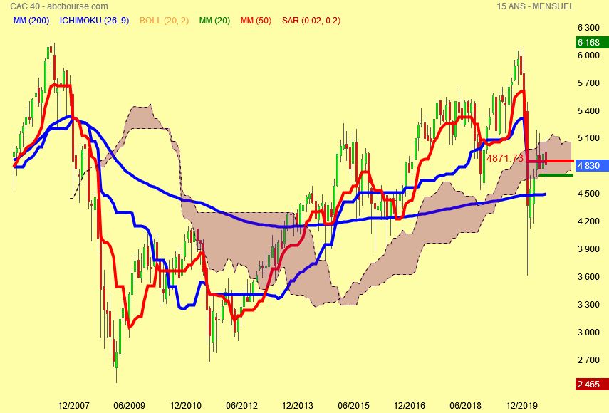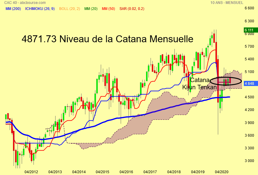 4871.73 points est le lieu de rendez vous en CATANA de la Kijun bleue et Tenkan rouge mensuel , donc ce n' est pas un hasard si le cours cherche à se rapprocher de ce seuil .