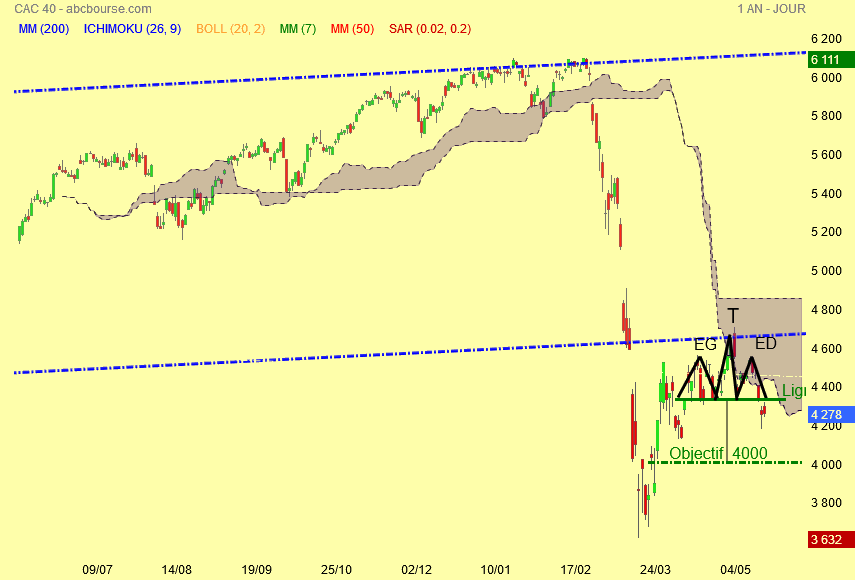 Pronostic pour pronostic, dans les temps qui viennent, pour les adeptes des graphiques, la butée - il y en aura bien une - d'ici à août pourrait être un cac à 5266 (Ichimoku à 5 ans en hebdo) avec une pause éventuelle aux alentours de 5168 (Fibonacci 61.8%). Des zones où les baisses éventuelles seraient à exploiter ?